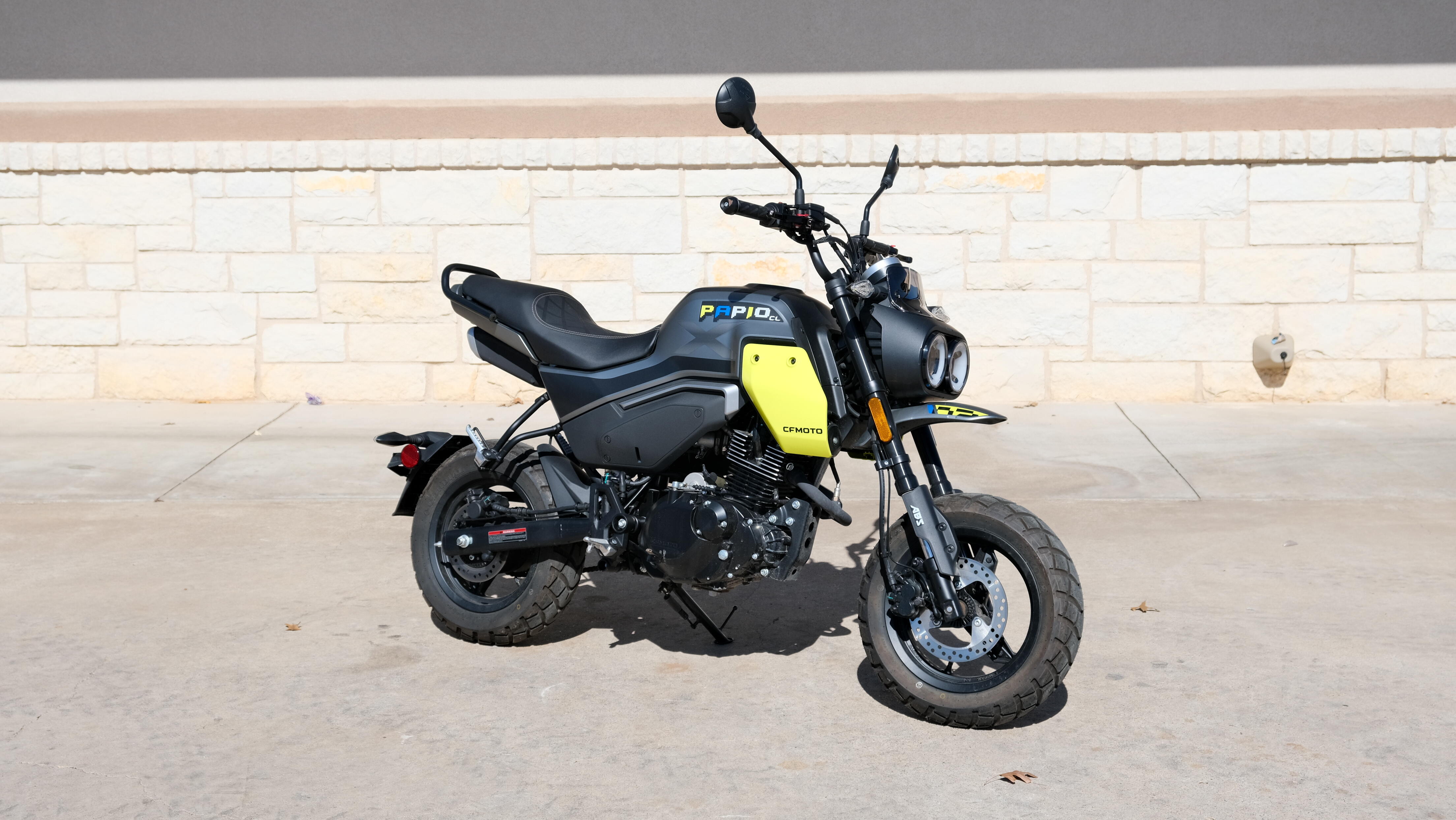 The Papio CL takes a dustier path. The single-piece saddle, lower footrests, and tall handlebar give it away. This mini moto has scrambler roots. The cockpit features a new round, semi-digital instrument cluster showing gear position, shifting indicator, RPM, time, and fuel level. The inverted fork gets lower covers for extra protection. Three spoke aluminum wheels are fitted with deeply treaded tires. Come in a little closer and you’ll discover top shelf disc brakes and ABS. Rugged places are calling. Your people are waiting. Your 2024 Papio CL is revving to go.